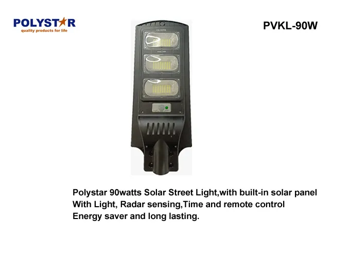 Polystar PVKL-90W is a 90W solar street light designed for energy-efficient and cost-effective outdoor lighting solutions.